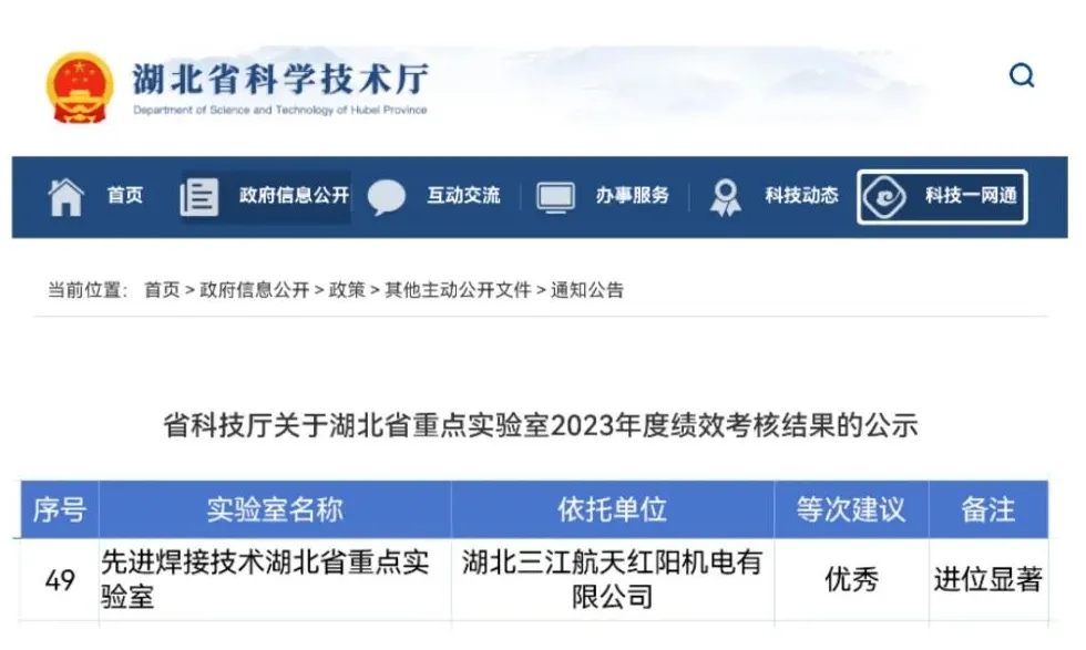 近日,依托航天科工九院紅陽公司建設的“先進焊接技術湖北省重點實驗室”在湖北省科技廳195家重點實驗室評估中獲評“優秀”。
