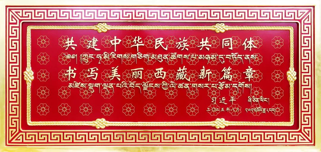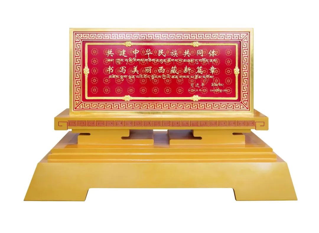 賀匾正面為習(xí)近平總書記題詞,背面展現(xiàn)西藏自治區(qū)成立60周年經(jīng)濟(jì)社會發(fā)展成就。整體造型端莊大氣,以鮮艷的中國紅為底色,采用格桑花紋、長城紋、繩結(jié)紋等獨(dú)具匠心的特色設(shè)計(jì),象征民族團(tuán)結(jié)、共同繁榮,寓意各民族共同熔鑄為中華民族共同體。