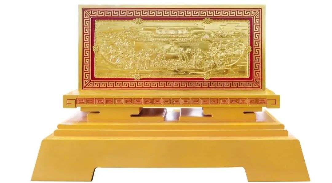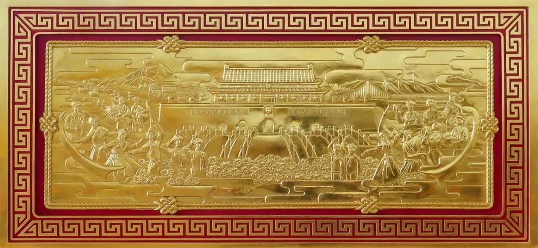 賀匾背面浮雕圖案造型整體采用貼金處理,為了更好體現(xiàn)浮雕效果,項(xiàng)目團(tuán)隊(duì)采用薄壁紫銅板鈑金制作,針對人物面部進(jìn)行精細(xì)鏨刻,完美體現(xiàn)人物面部特點(diǎn),生動呈現(xiàn)“中華民族一家親”的和諧畫面。